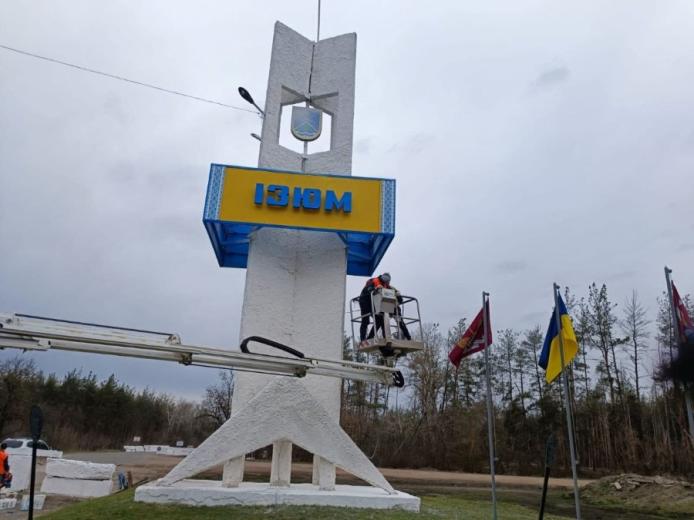 Комунальники Ізюма оновлюють в’їзний знак / Фото: сторінка фейсбук КП «Благоустрій міста Ізюм»