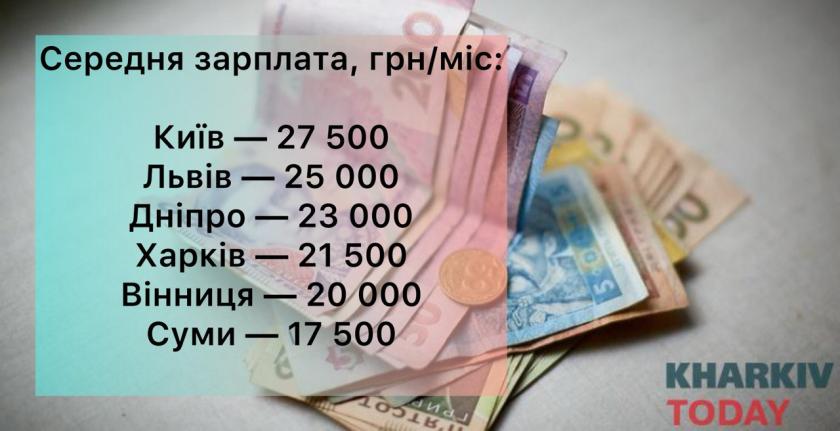 За рівнем заробітних плат Харків — відносно дешеве місто. За даними порталу Work.ua, за рік зарплатня в місті зросла на 19%. У середньому роботодавці пропонують харків’янам 21 500 грн/місяць. Це — набагато менше, ніж у столиці, де середньостатистичний працівник за один місяць роботи отримує 27 500 гривень, але набагато більше, ніж у Сумах, де в середньому платять усього 17 500 гривень, і навіть більше, ніж у Вінниці, яка в безпековому відношення має набагато вигідніші умови.