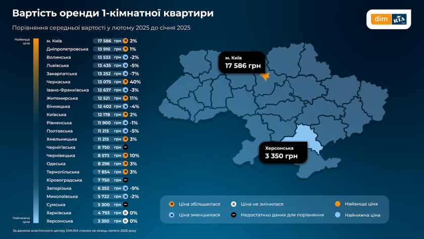 За даними аналітичного центру українського маркетплейса нерухомості DIM.RIA, найдорожчим містом за вартістю оренди житла незмінно лишається столиця. У лютому 2025 року середня вартість орендної плати за однокімнатну квартиру в Києві становила 17,6 тис. грн.