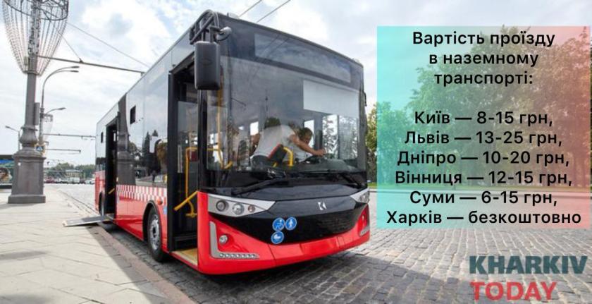 У Харкові зараз на основних маршрутах курсує лише муніципальний транспорт, тоді як в інших містах України збереглися приватні перевізники. Оскільки метрополітен, крім Харкова, є лише в Києві та Дніпрі, ми порівняли вартість проїзду в наземному транспорті. Він також різний у різних містах: у Львові превалюють трамваї, у Сумах — автобуси.