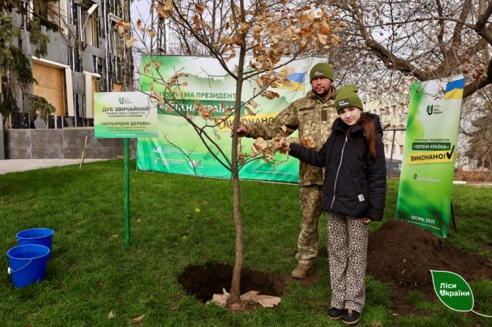 Мільярдне дерево — дуб, як символ стійкості, сили та незламності українців, посадили ветеран російсько-української війни, співробітник Зміївського надлісництва ДП «Ліси України» Юрій Шапка та 9-річна Олександра Чорна, донька працівниці Ізюмського надлісництва. Ця спільна висадка дерева воїном і дитиною символізує майбутнє України, заради якого і ведеться боротьба.