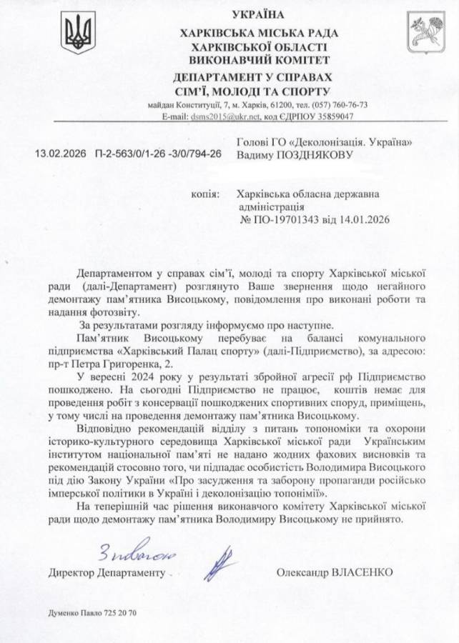 «Харківська міська рада досі не ухвалила рішення про демонтаж пам’ятника російському співаку Владіміру Висоцькому біля розбитого російськими ракетами Палацу Спорту. Звертаємося з вимогою нарешті ухвалити це рішення та провести демонтаж. У 2026 році дико мати такий об’єкт. Це один з останніх найбільших російських пам’ятників у місті. І на часі нарешті його прибрати», йдеться у заяві активістів.
