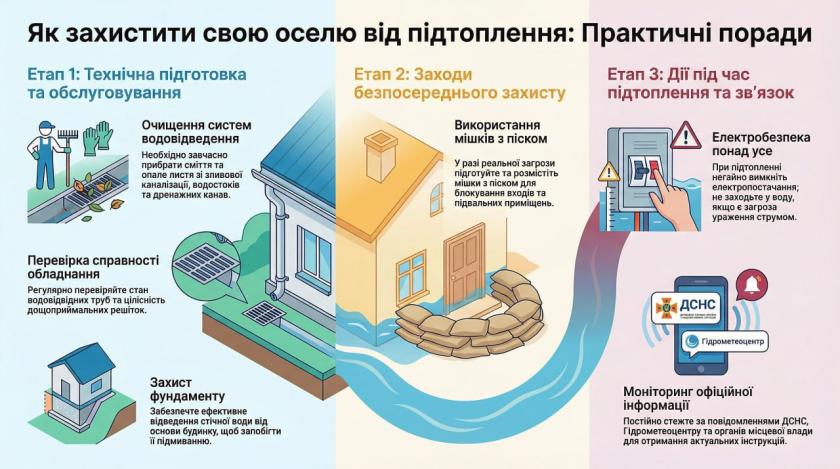 Оскільки найбільше потерпають від підтоплень приватні будинки, в ДСНС радять заздалегідь подбати про те, аби двори та приміщення не затопило. Для цього потрібно:
