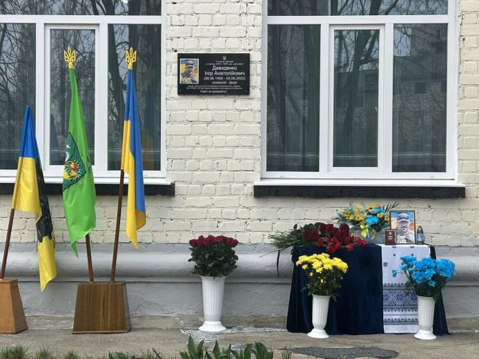 У Харківській гімназії № 22 встановили пам’ятну дошку на честь головного сержанта 1-ї стрілецької роти військової частини А7400 Ігоря Давиденка (позивний Дядя). Захисник загинув під час виконання бойового завдання поблизу населеного пункту Нова Гусарівка Харківської області. Йому було 55 років.