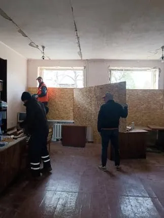 Комунальники Ізюма закривають вибиті вікна в освітньому закладі Балаклії / Фото: Ізюмська МВА