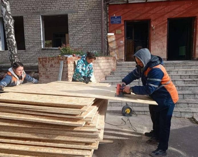 Робітники КП «Благоустрій міста Ізюм» долучилися до ліквідації наслідків ворожого обстрілу в Балаклії. Вони закрили контури вікон у закладі позашкільної освіти. Листами ОСБ було «зашито» 66 віконних пройм.