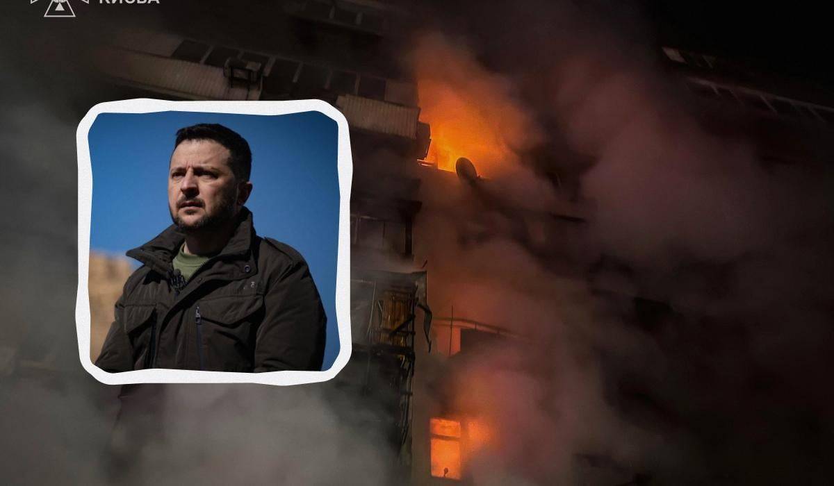Зеленский напомнил, что в результате удара по Киеву уже известно о трех погибших, десятки людей ранены, и среди них есть дети, а также повреждены обычные многоэтажки в нескольких районах города.