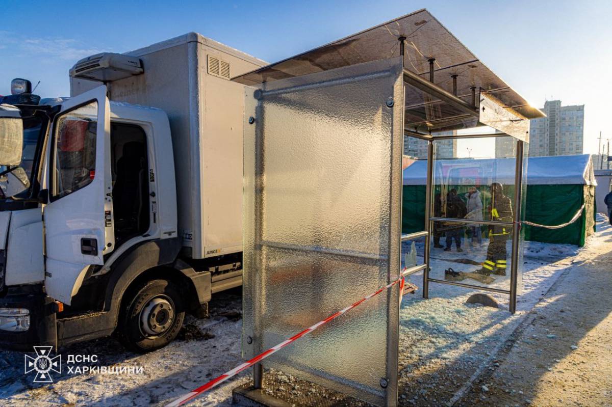 У Слобідському районі пошкоджено торговельні павільйони, зупинку громадського транспорту та вантажне авто.