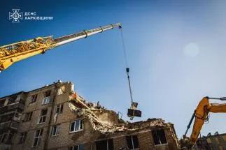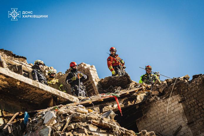 У Харкові триває ліквідація наслідків прямого влучання ракети у п’ятиповерховий житловий будинок. Рятувально-пошукова операція не припиняється, оскільки під завалами можуть перебувати люди.