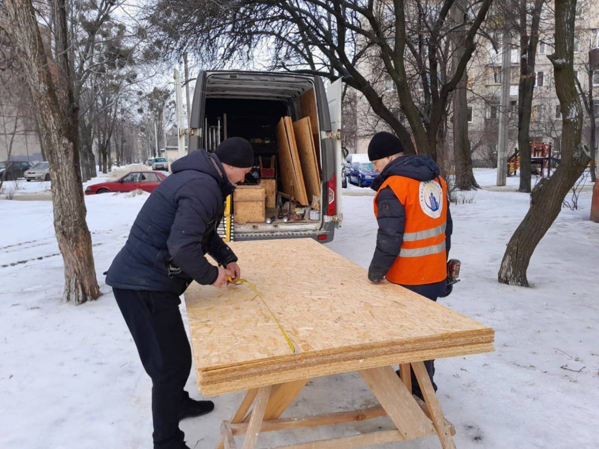 - Працівники КП «Харківжитлобуд» закривають вибиті вікна у квартирах та під’їздах дерев’яними щитами.