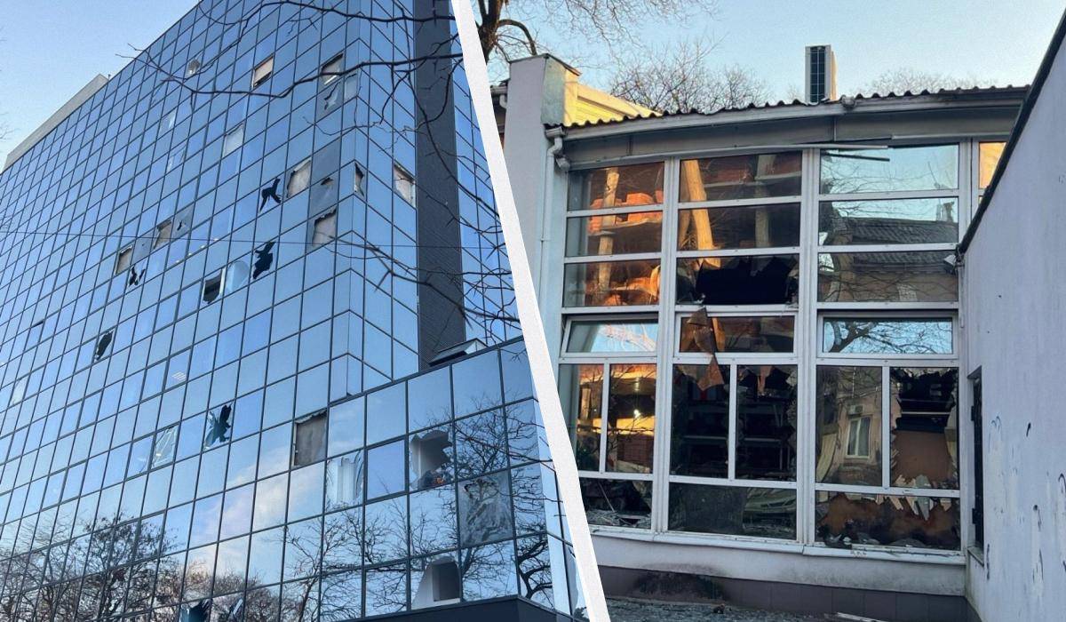 В результате атаки повреждено остекление фасада здания / коллаж УНИАН, фото t.me/zloyodessit