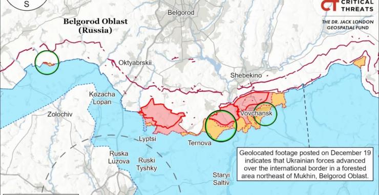 «Українські сили нещодавно провели обмежену транскордонну атаку в прикордонній зоні Бєлгородської області. Оцінка просування українських військ: Геолокаційні кадри, опубліковані 21 грудня, свідчать про те, що українські війська нещодавно просунулися через міжнародний кордон у лісовий масив на північний схід від Мухіна, Бєлгородська область (на південний схід від Шебекіно і менш ніж за кілометр від міжнародного кордону) під час обмеженої транскордонної атаки», — повідомляє ISW.