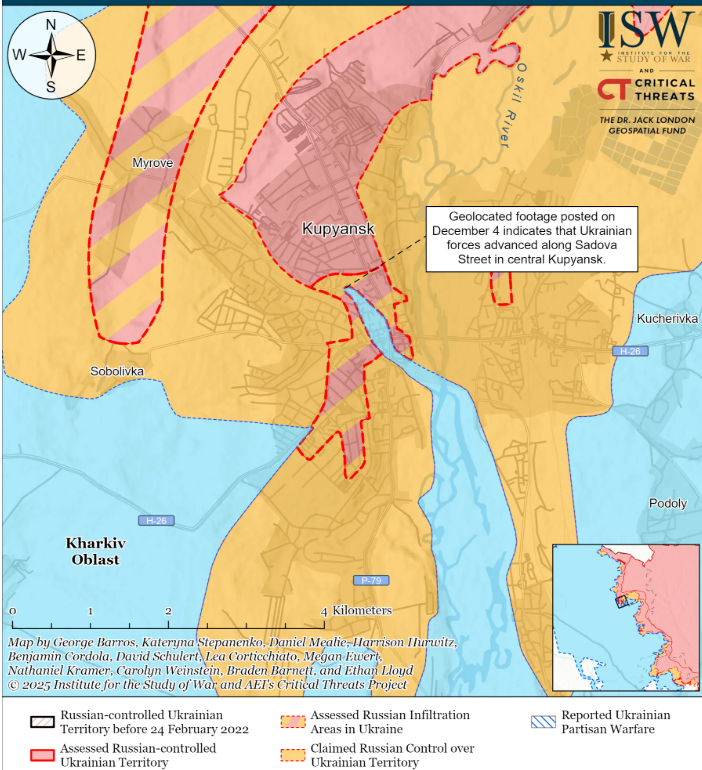 «Російські війська атакували поблизу самого Куп’янська та на південний схід від Куп’янська поблизу Піщаного, Степової Новоселівки та Глушківки 4 та 5 грудня. Російський військовий блогер стверджував, що українські війська контратакували на західній околиці Куп’янська», йдеться в повідомленні.
