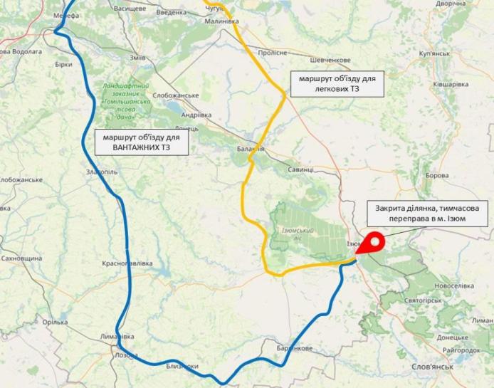 Також, як повідомили у пресслужбі Ізюмської МВА, через перекриття дороги у місті тимчасово змінили схему руху автобусів.