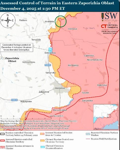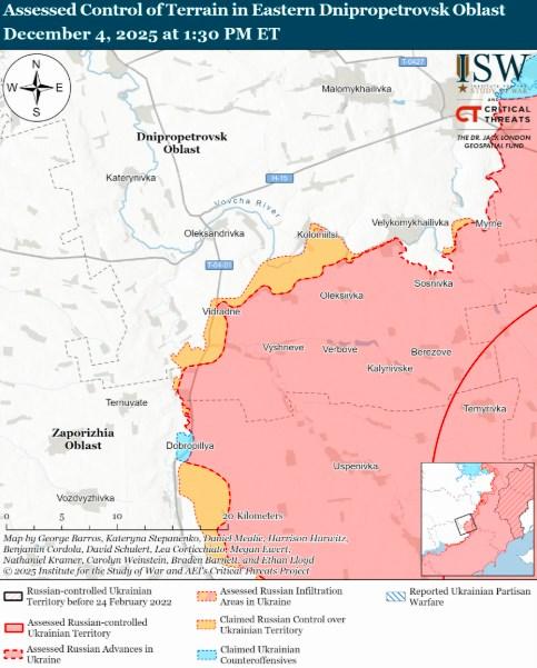«Кадры от 4 декабря, на которых видны украинские войска, действующие в центре Доброполья, указывают на то, что российские войска в настоящее время не занимают позиции на восточном берегу реки Гайчур к западу от Доброполья, в районе, где, по ранее заявленным российским источникам, сохранялось присутствие российских войск», — подчеркивают аналитики.