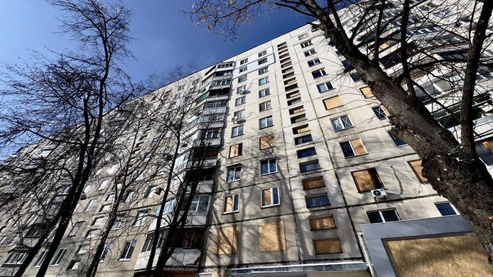 У Харкові триває відновлення 12-поверхового будинку на вулиці Академіка Павлова, який постраждав під час російських обстрілів.