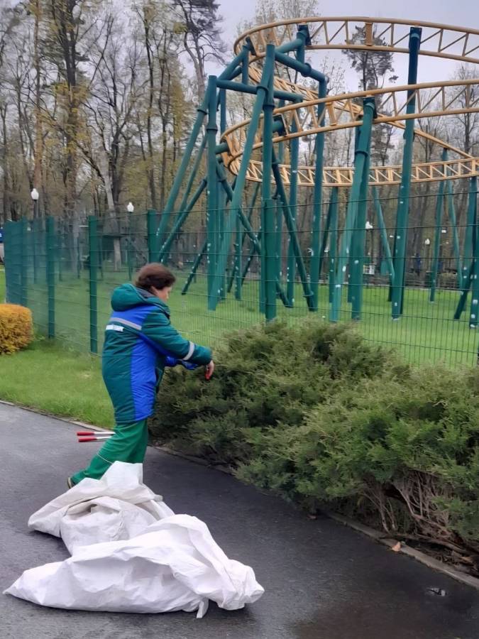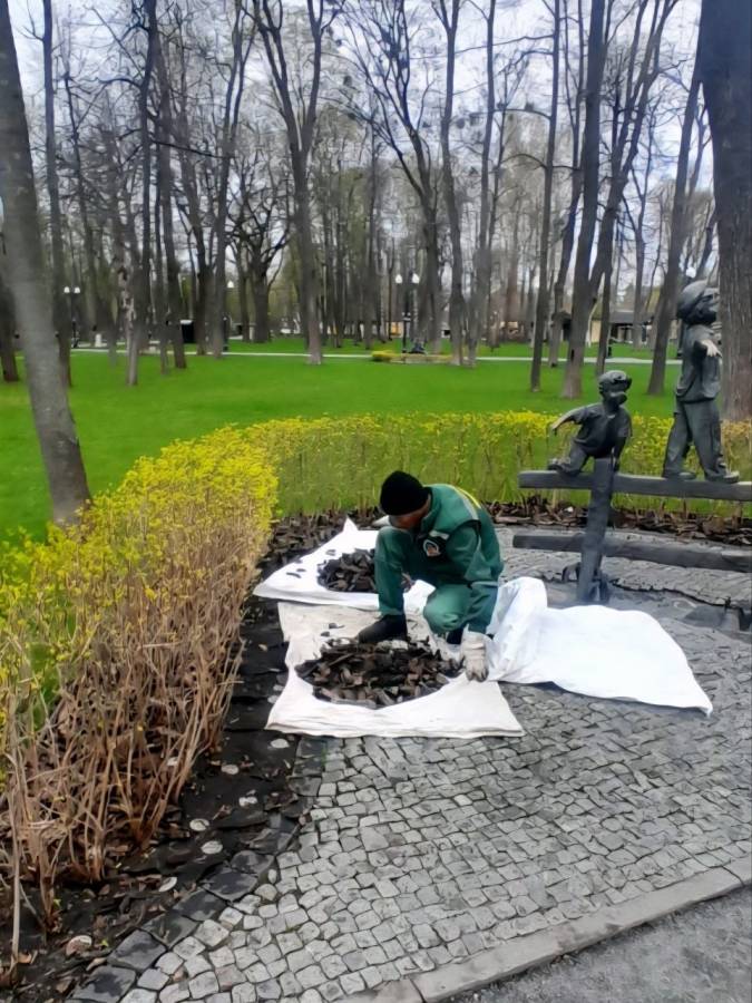 У Центральному парку тривають сезонні роботи з догляду за зеленими насадженнями. Зокрема, озеленювачі проводять декоративне обрізання та формують кущі ялівцю, а також займаються вичісуванням газонів і аерацією ґрунту.