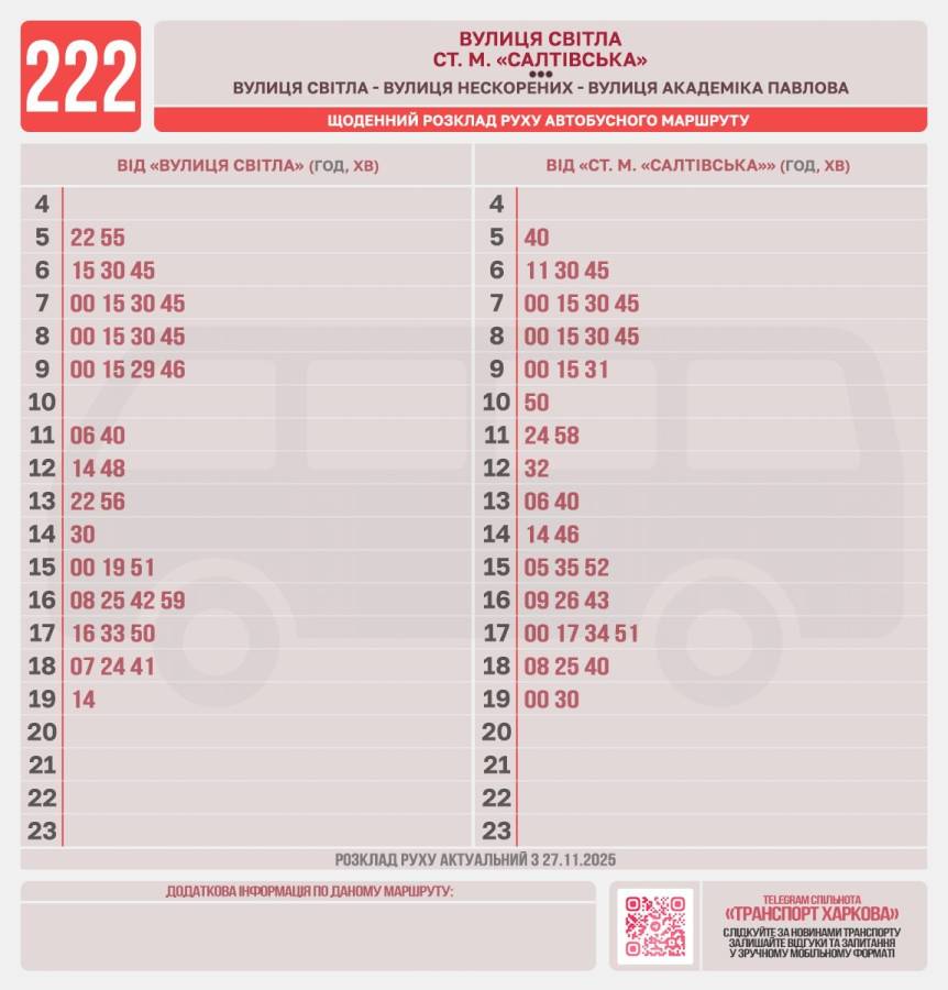 Автобусний маршрут № 222 буде подовжено до вул. Світла: ст. м. «Салтівська» – вул. Академіка Павлова – вул. Нескорених – вул. Світла – вул. Світла (вул. Бучми).
