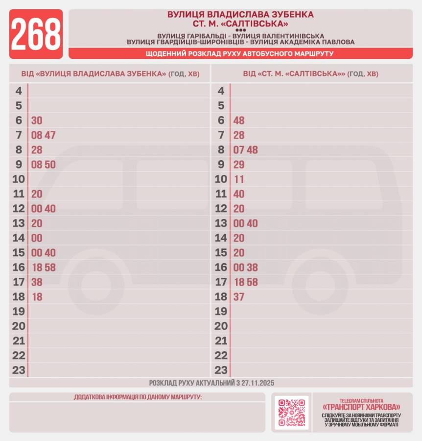 Автобусний маршрут № 268 буде скорочено до ст. м. «Салтівська»: вул. Владислава Зубенка – вул. Гарібальді – вул. Валентинівська – вул. Гвардійців-Широнівців – вул. Нескорених – вул. Академіка Павлова – ст. м. «Салтівська».