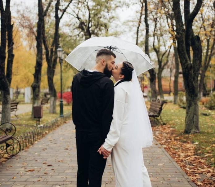 Весілля призначили на 25 жовтня 2025 року — у дзеркальну дату — без фати і звичної у таких випадках метушні: вона у білому спортивному костюмі, він — у чорному. Церемонія пройшла у Балаклії, у невеликому РАЦСі. Начальниця установи особисто провела весільний обряд. А після пара скромно відсвяткувала одруження в колі рідних та близьких.